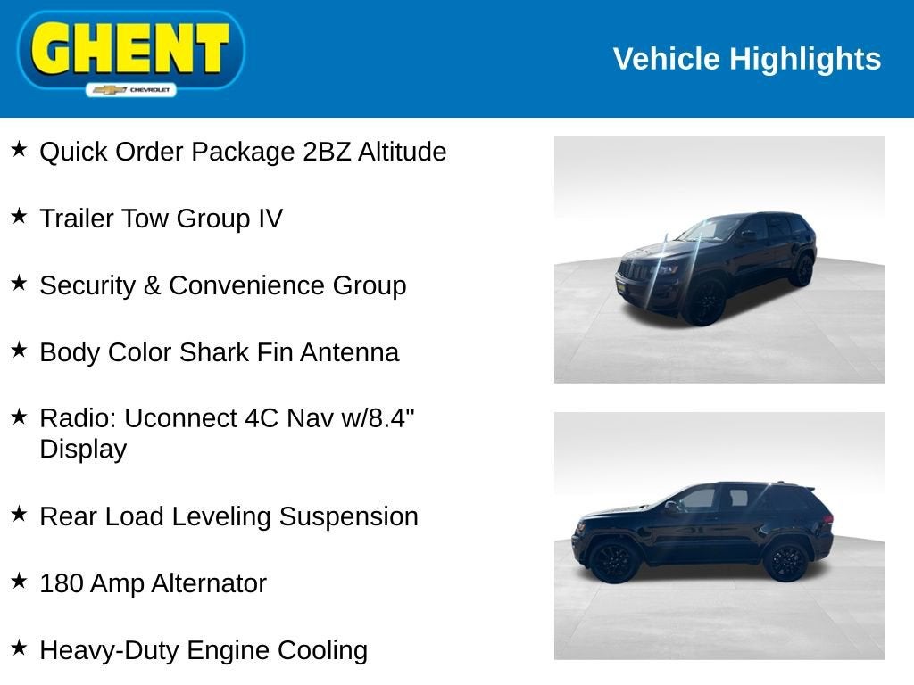 Step inside this Jeep Grand Cherokee Altitude and experience the perfect blend of rugged capability and refined luxury. The spacious interior features premium cloth bucket seats, a heated steering wheel, and a power liftgate for effortless loading and unloading. Stay connected with the advanced Uconnect 4C navigation system, complete with an 8.4-inch touchscreen display, SiriusXM satellite radio, and a 4G LTE Wi-Fi hotspot.